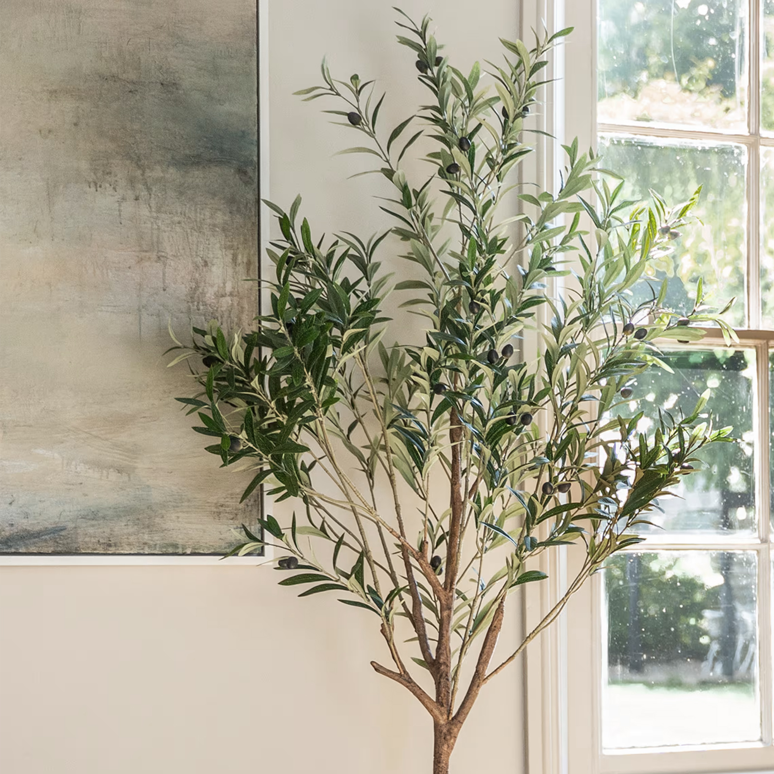 I love to add faux olive trees to a room as it instantly softens the space. Olive trees bring such a calm Mediterranean feel, but the faux version means there’s absolutely no upkeep.